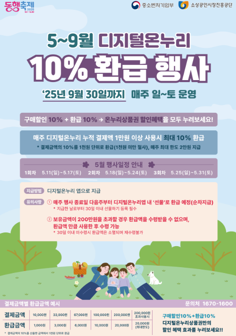 디지털 온누리상품권 환급 행사는 2025년 5월 11일부터 9월 30일까지 총 20주간 진행됩니다.