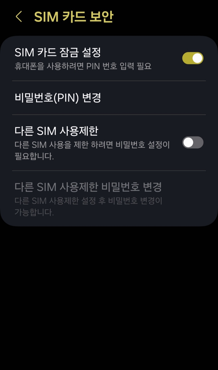 | 안드로이드 | 설정 ➔ 연결 ➔ SIM 카드 관리자 ➔ SIM 잠금 | 재부팅/교체 시 PIN 필요 |