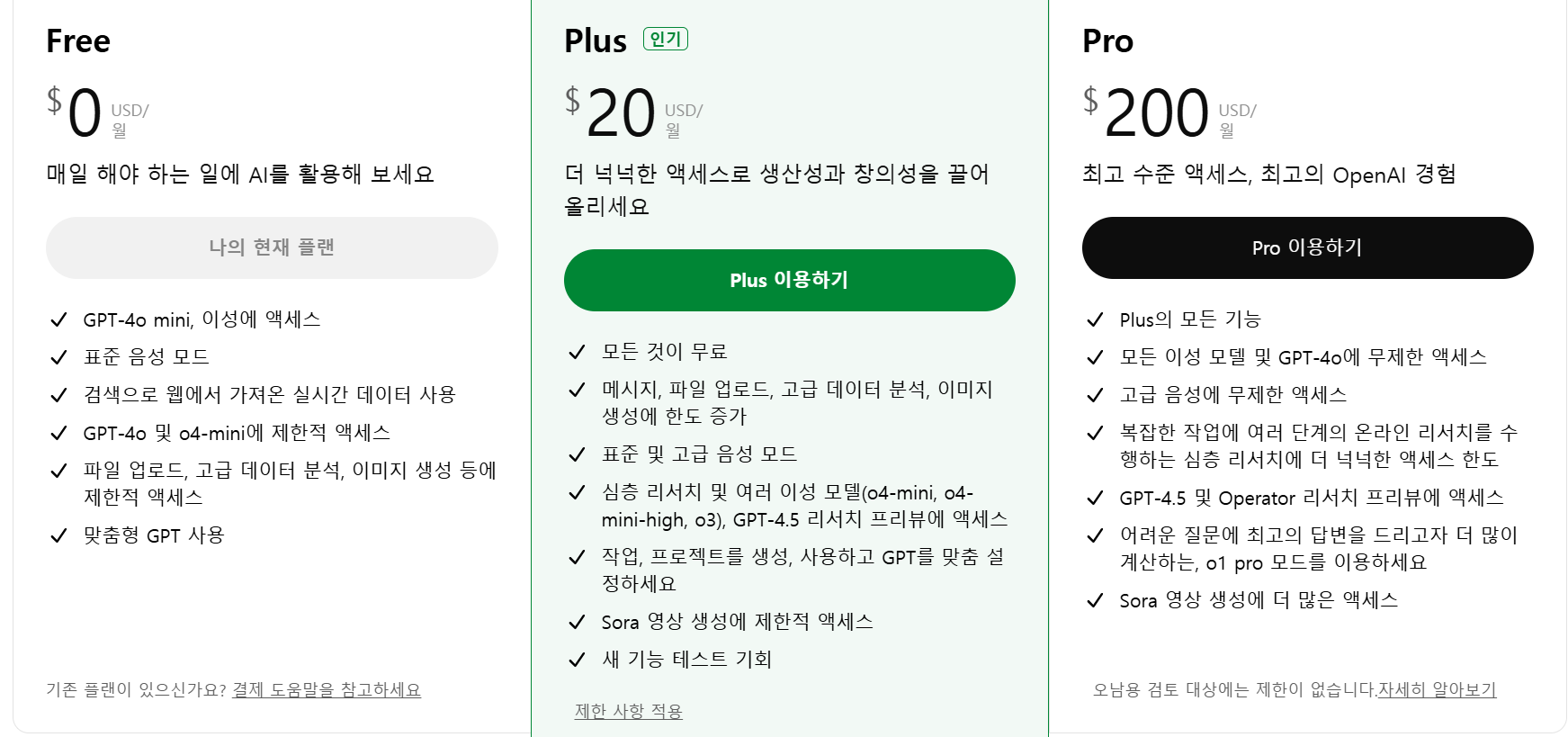 현재 일반 사용자는 무료 플랜 또는 GPT Plus 중 선택이 가능하며, Pro는 기업 및 고급 사용자 대상 옵션으로 점차 확대 중입니다.