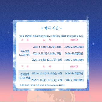 - 5월 20일 ~ 9월 9일: 20:00 ~ 21:00 (60분)